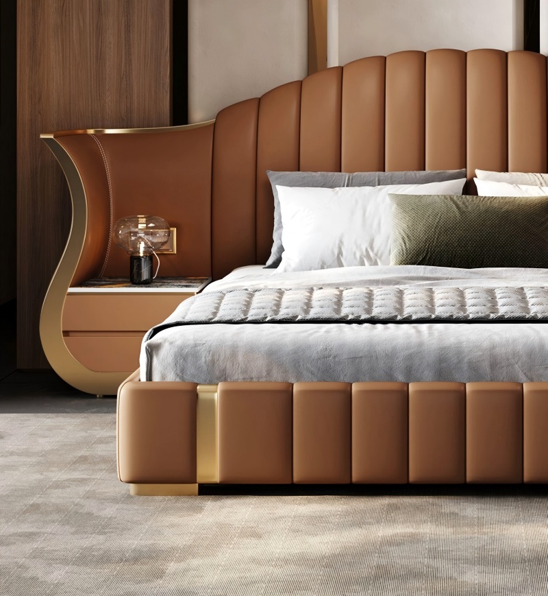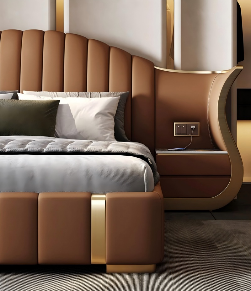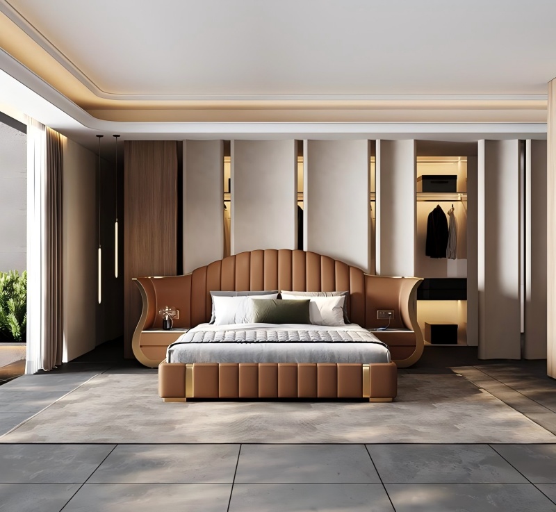 Questo letto grande progettato elegantemente integra i comodini a doppia faccia. È realizzato con materiali di alta qualità [legno massiccio/pelle/tessuto]. La testiera allargata a 1,8 metri è abbinata a armadi di stoccaggio simmetrici, che non solo soddisfa le esigenze di stoccaggio prima di andare a letto, ma crea anche un'estetica spaziale armoniosa.