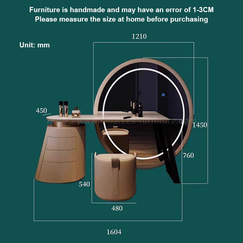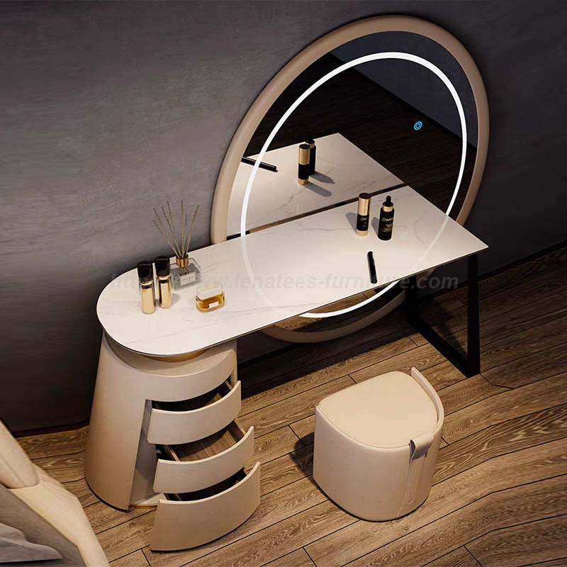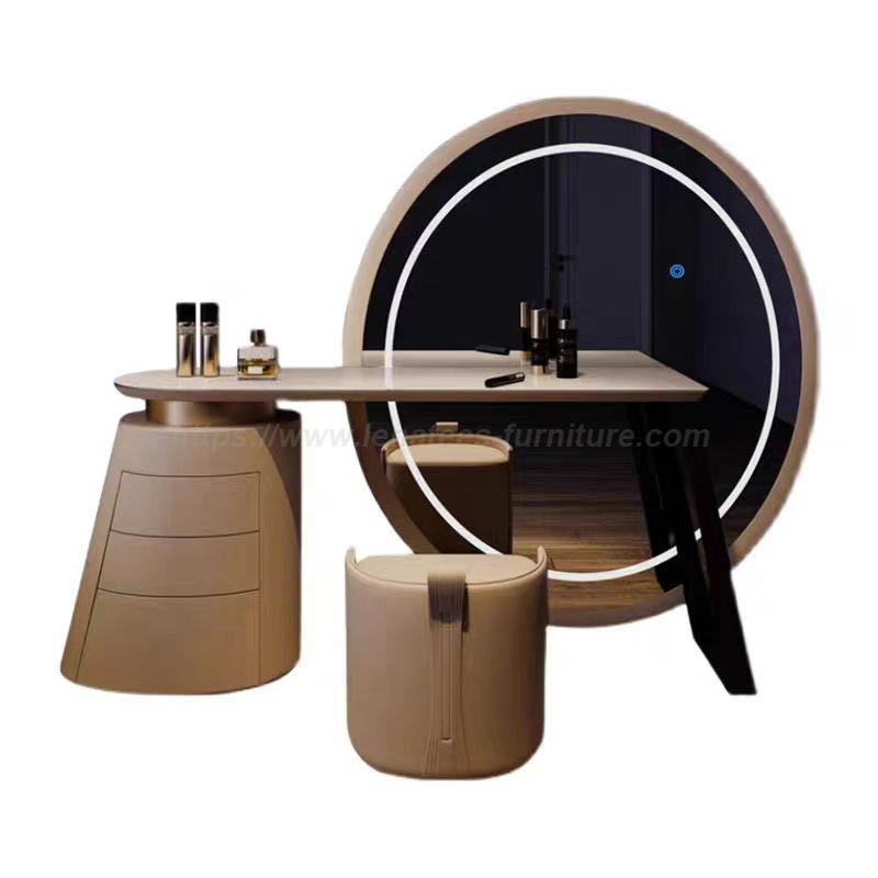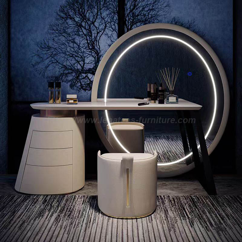 Il nuovo design adotta l'estetica geometrica di linee curve arrotondate, lusso leggero e vanità bellissimo, piccolo volume e multiuso, per illuminare la tua bellezza. Dotato di specchio per il trucco, tavolo, mobile, sgabelli da trucco. Vernice di piastra di roccia, materiale in titanio in acciaio inossidabile. Specchio con luce a LED e porta multifunzione USB